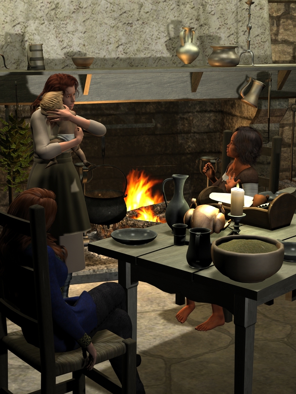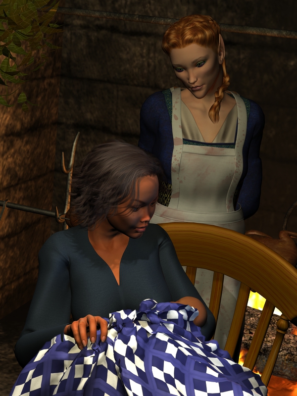 Tia assembles candles on the table in their "borrowed" house. She arranges them in an arc like the stars of her goddess and explains the significance of the brightness and number of stars to Dannic, answering any questions he has patiently and simplely as needed.
