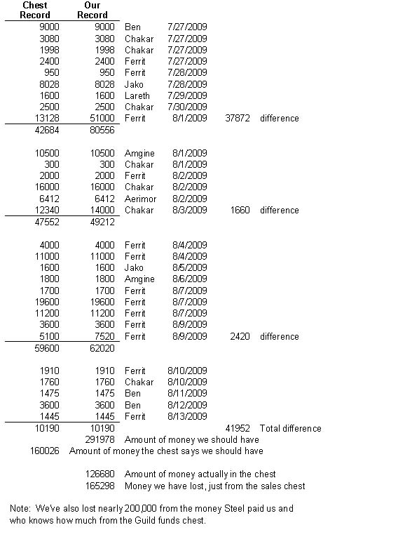 Record of current sales and money lost