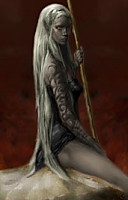 This slender elf has pale grey skin and light white shoulder length hair. She steps cautiously avoiding sudden movement. If it is visible, a long scar forms a rough red ridge from the bottom of her rib cage toward her hip.