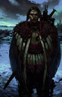 Eagle is six foot tall with dark, smooth skin having little body hair, with none on his face and tattoo's of black and blue in various places on his body which is lean but well defined and appears strong. The hair on his head is dark and long with feathers braided into a few braids that hang down near his temples held together with beads and small strips of leather.